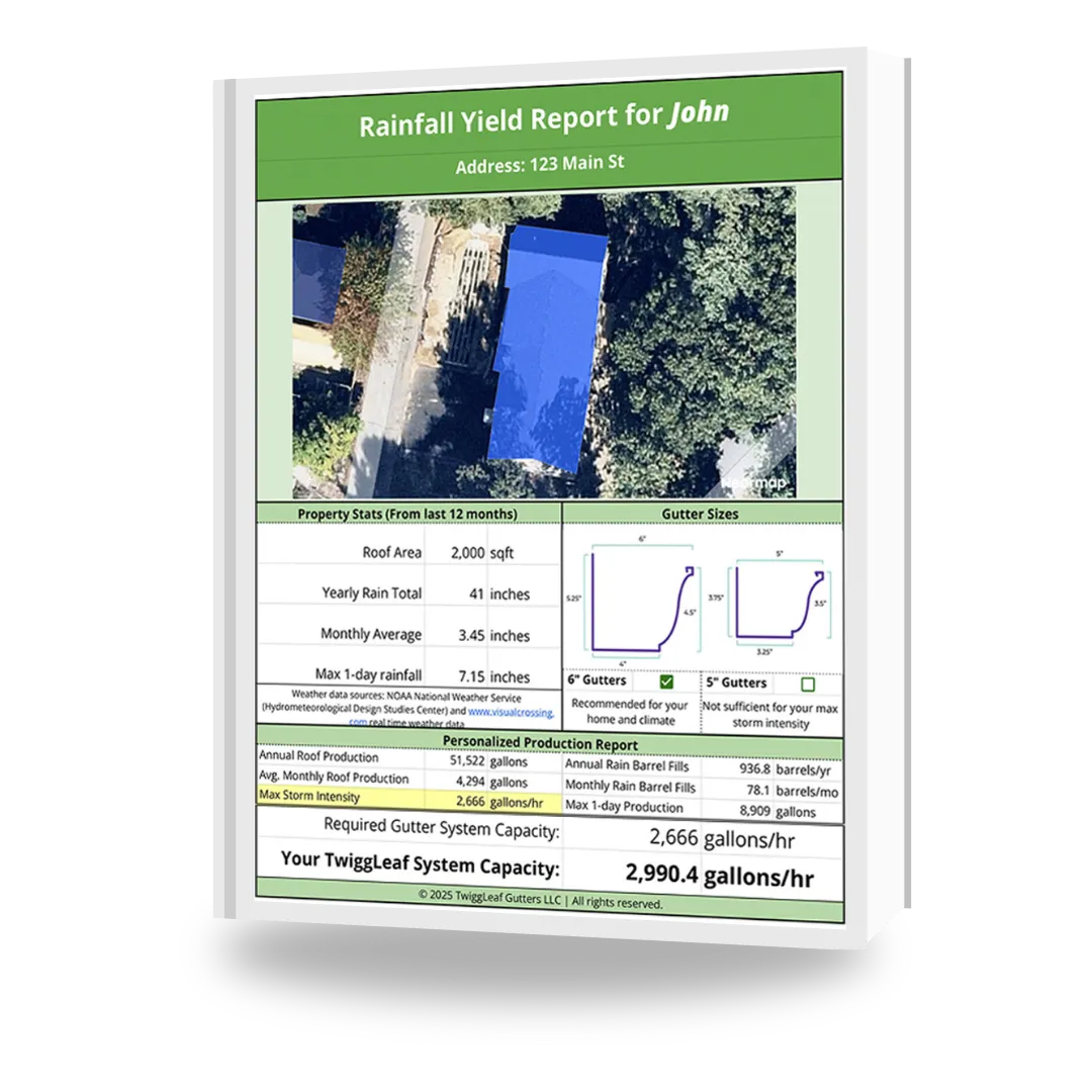 Know that you need gutters? Now you need to know how big of a system you need. This report pulls your homes historical weather data and uses your roof area to calculate how much water you flow. After getting this report you can confidently choose between 5" and 6" gutters.